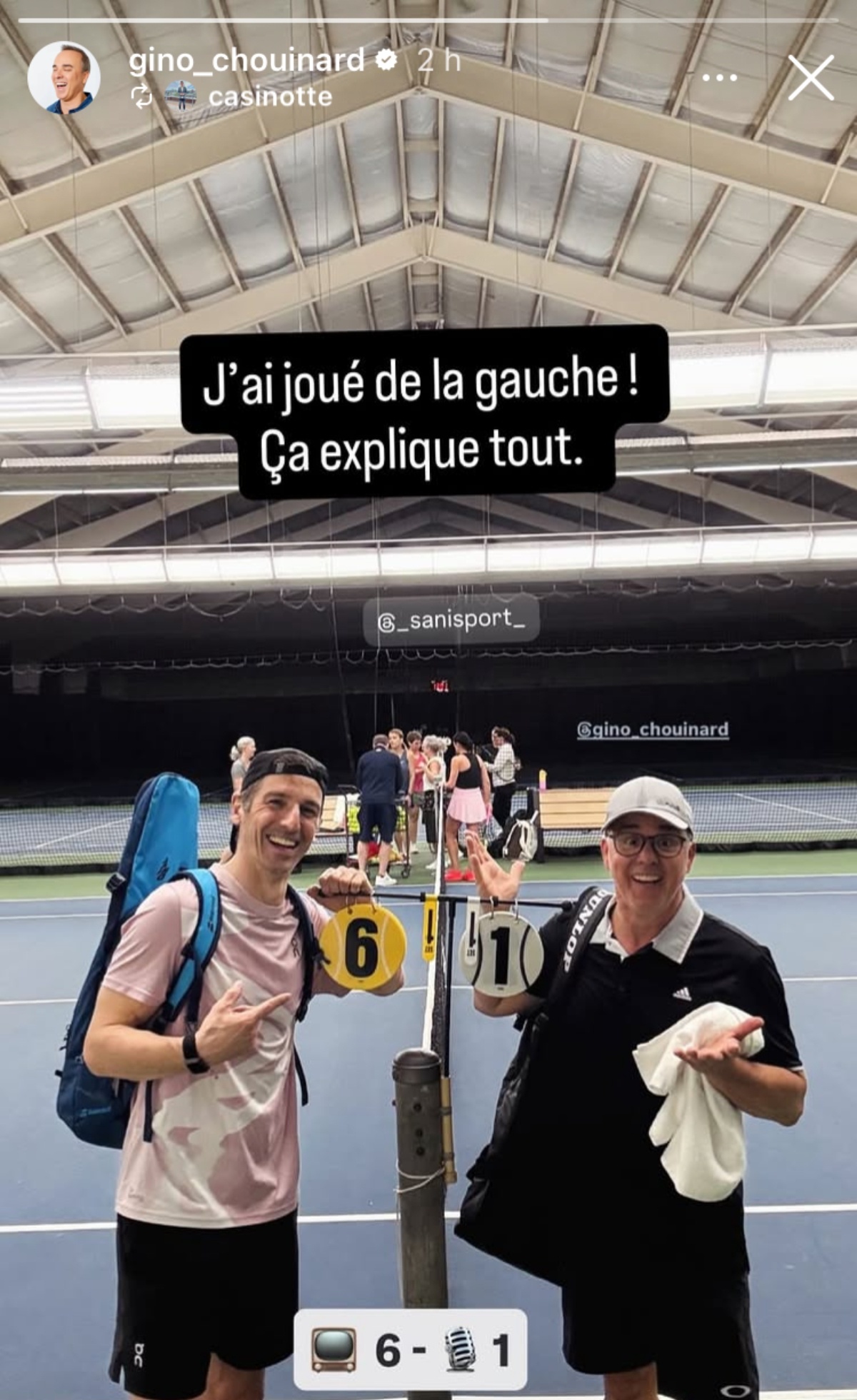 Le chroniqueur a rejoint Gino Chouinard pour une partie de tennis. On peut voir le tableau des points qui indique que l’ancien animateur a perdu le match. En effet, Charles-Antoine Sinotte a remporté la victoire avec 6 points contre 1!