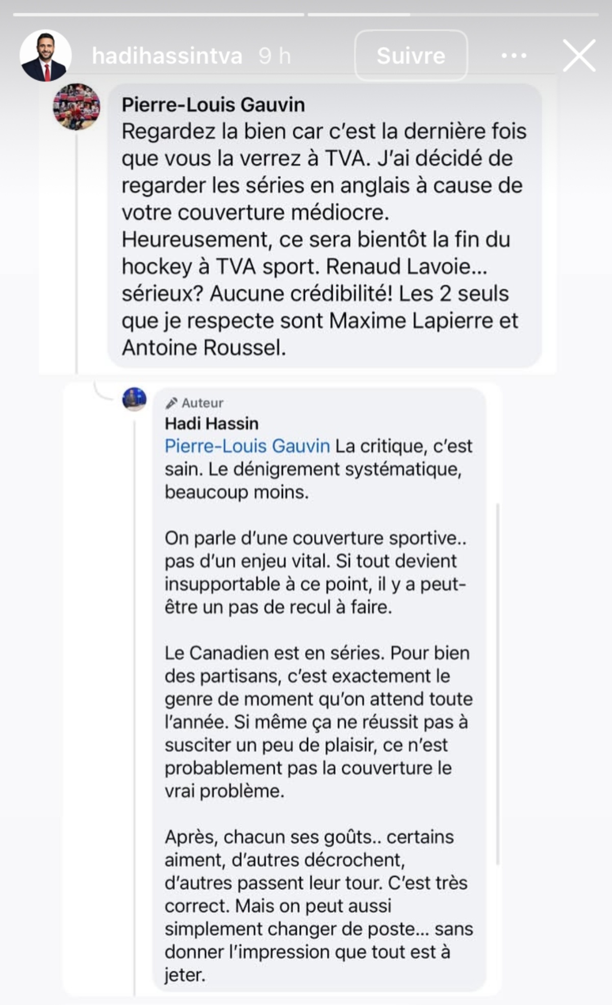 « Regardez-la bien, car c’est la dernière fois que vous la verrez à TVA. J’ai décidé de regarder les séries en anglais à cause de votre couverture médiocre. Heureusement, ce sera bientôt la fin du hockey à TVA Sports. Renaud Lavoie… sérieux ? Aucune crédibilité ! Les 2 seuls que je respecte sont Maxim Lapierre et Antoine Roussel. »
