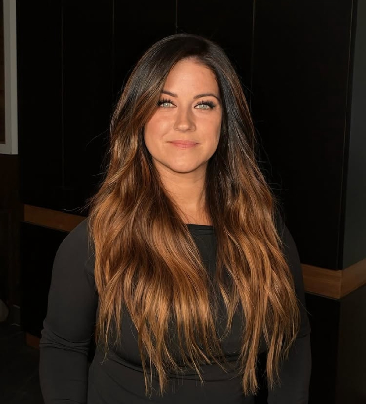 On est sur une base brun profond naturel (espresso/chocolat) Les longueurs évoluent vers un caramel miel / doré, avec des reflets lumineux et multidimensionnels