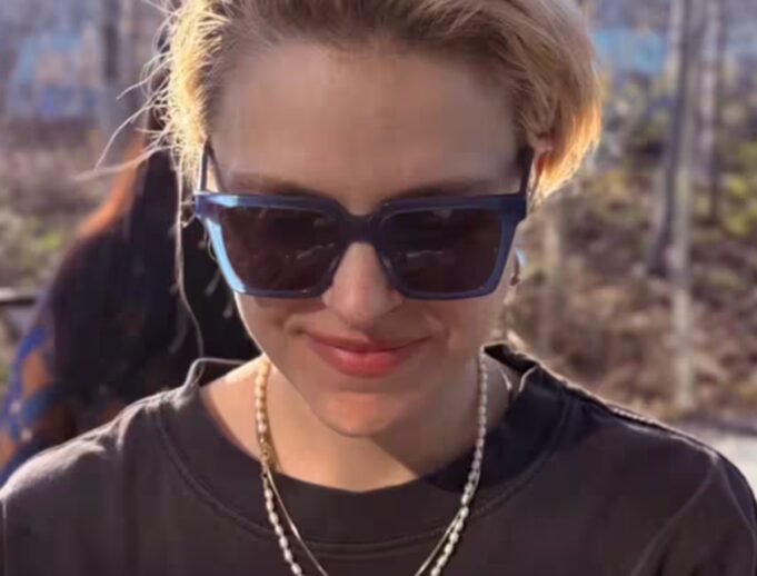 Ci-dessus, on peut voir Sarah-Jeanne avec ses cheveux blonds coupés très courts.